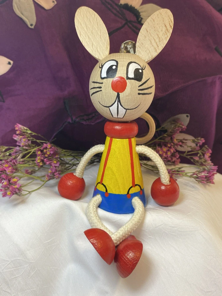 Díky pevnému dřevěnému kolečku na horní části pružiny lze hračku snadno zavěsit – například do dětského pokoje, nad postýlku nebo do hracího koutku. Po jemném popostrčení se hračka začne vesele houpat a pohupovat, čímž přirozeně přitahuje dětskou pozornost a podporuje hravost.