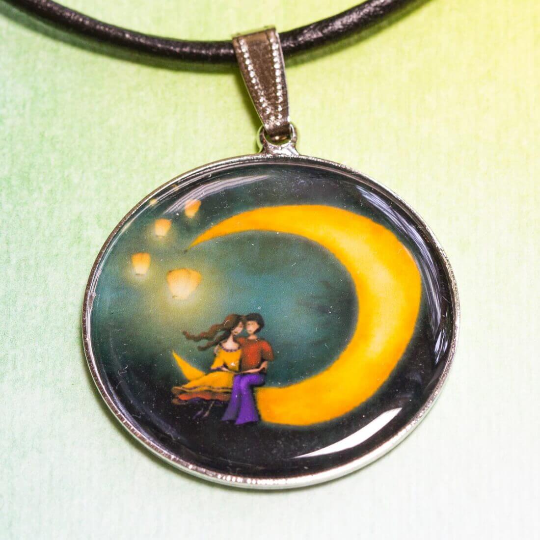 Náhrdelník s autorským motivem. Přívěsek je tvořen kovovým lůžkem průměru 32 mm a čočkou z křišťálové pryskyřice. Čočka s obrázkem má průměr 30 mm. Přívěsek je zavěšený na kožené kulaté šňůrce o průměru 3 mm, s nastavitelnou délkou. Materiál bižuterní kov (neobsahuje nikl) a epoxidová čočka, k... celý popis