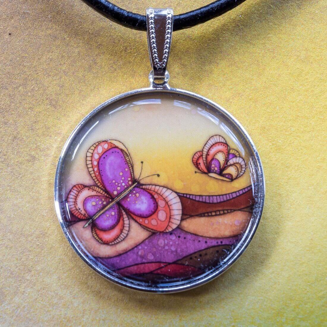 Náhrdelník s autorským motivem. Přívěsek je tvořen kovovým lůžkem průměru 32 mm a čočkou z křišťálové pryskyřice. Čočka s obrázkem má průměr 30 mm. Přívěsek je zavěšený na kožené kulaté šňůrce o průměru 3 mm, s nastavitelnou délkou. Materiál bižuterní kov (neobsahuje nikl) a epoxidová čočka, k... celý popis