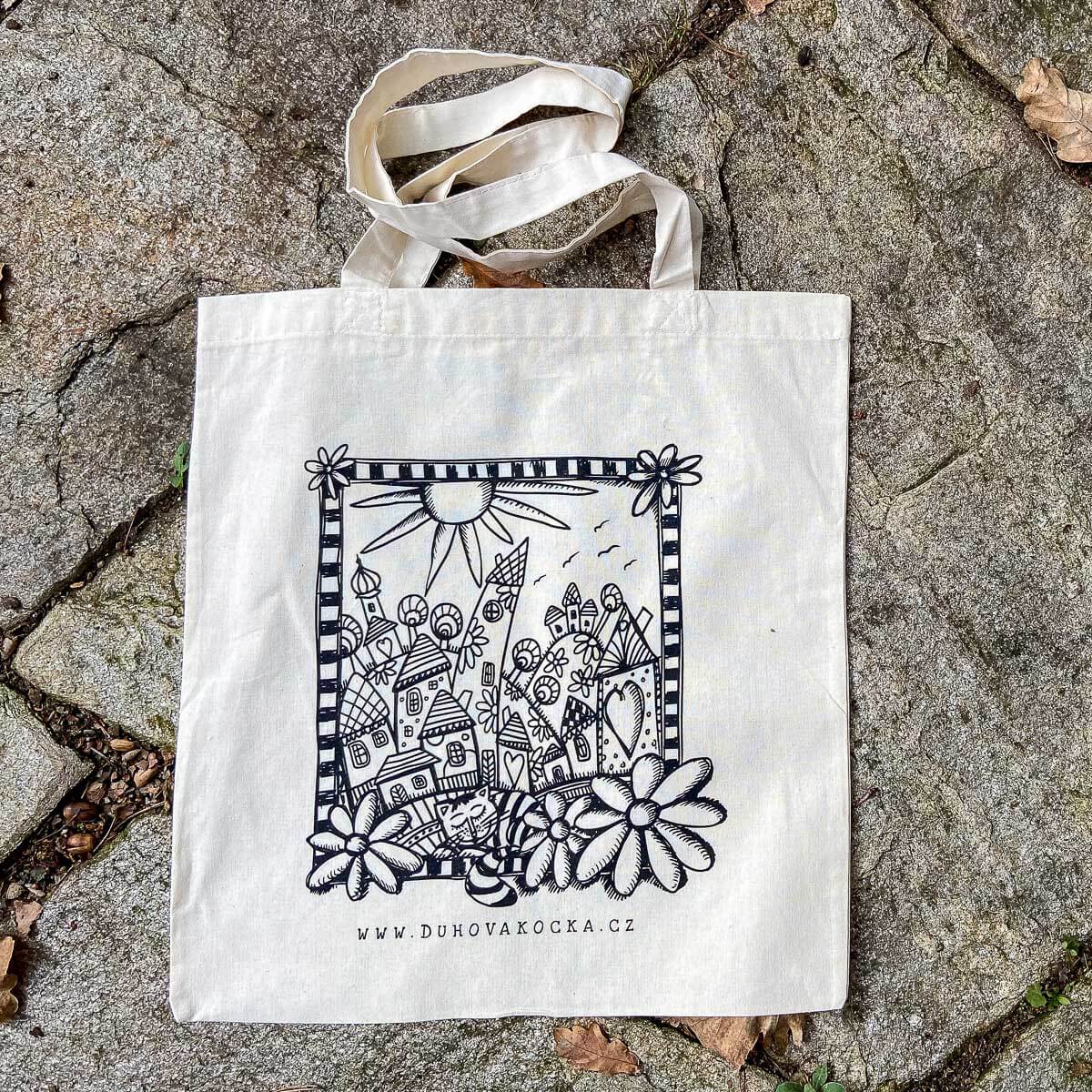 Bavlněná, lehká taška na malé nákupy s veselým inspirativním obrázkem k domalování.