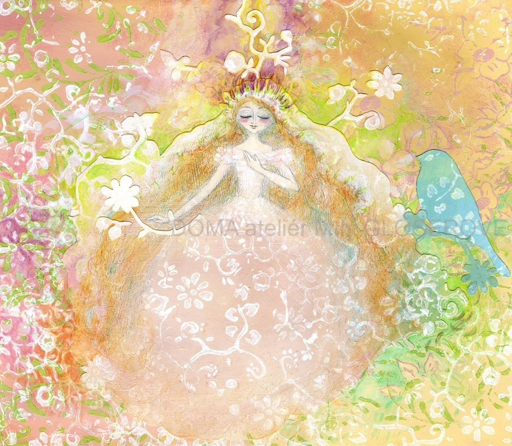 Obraz „Nevěsta“ od Miluše Gloserové evokuje krásu a něžnost přechodu z dívky v dospívající ženu, symbolizovanou růžovobílými červánky a tajemným lesem. Motiv zní jako ptačí zpěv na oslavu přerodu a nových začátků.