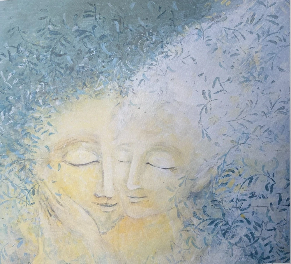 Obraz „Láska“ vyjadřuje intimní spojení, něhu a blízkost dvou bytostí. Dvě tváře, které se objímají, vyzařují teplo, vzájemnou podporu a tichou hloubku citu. Celá kompozice je laděna do uklidňujících modrých tónů, které podtrhují klid, harmonii a pocit bezpečí v objetí milované osoby.